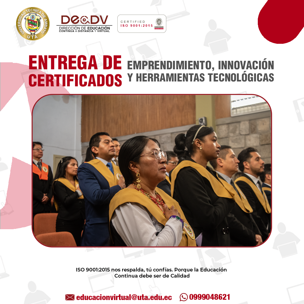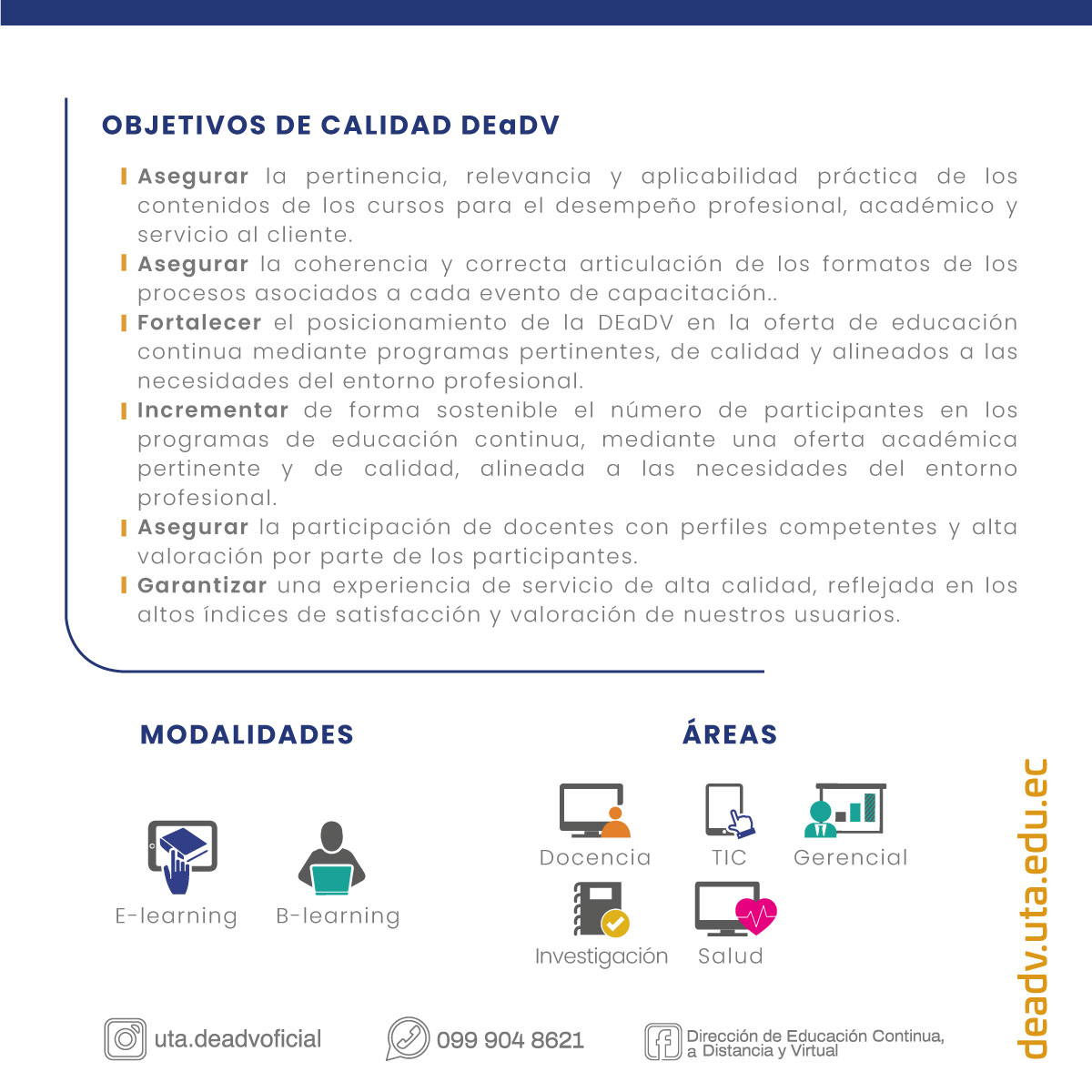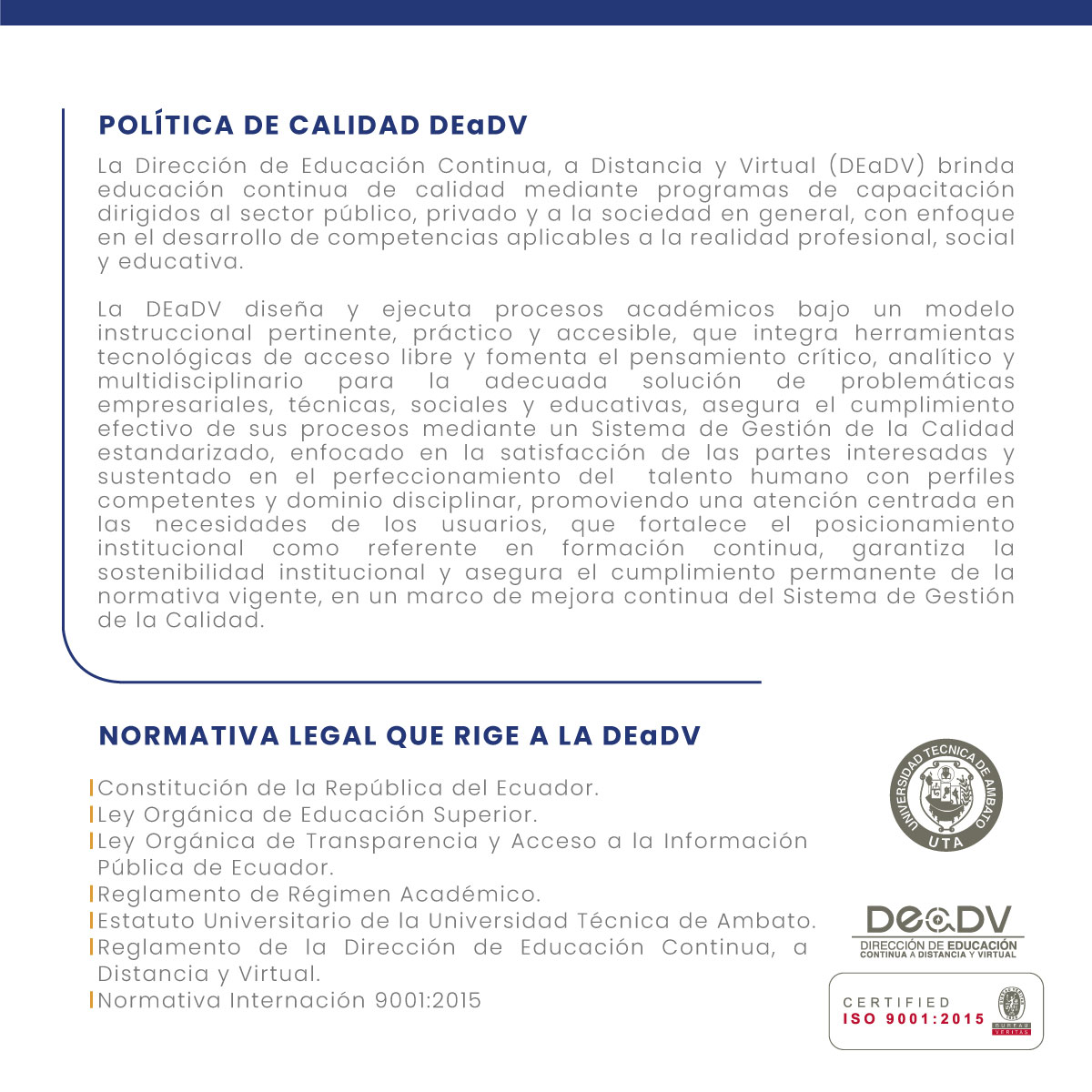 Los procesos de capacitación y formación ofertados por la DEaDV se desarrollan bajo estándares internacionales de calidad en concordancia con los principios de la norma ISO 9001:2015, lo que garantiza una gestión académica estructurada, confiable y orientada a la mejora continua, a través de sus dos modalidades asegurando el acceso a programas de capacitación de alto nivel que fortalecen las competencias profesionales y contribuyen a la generación y transferencia del conocimiento.